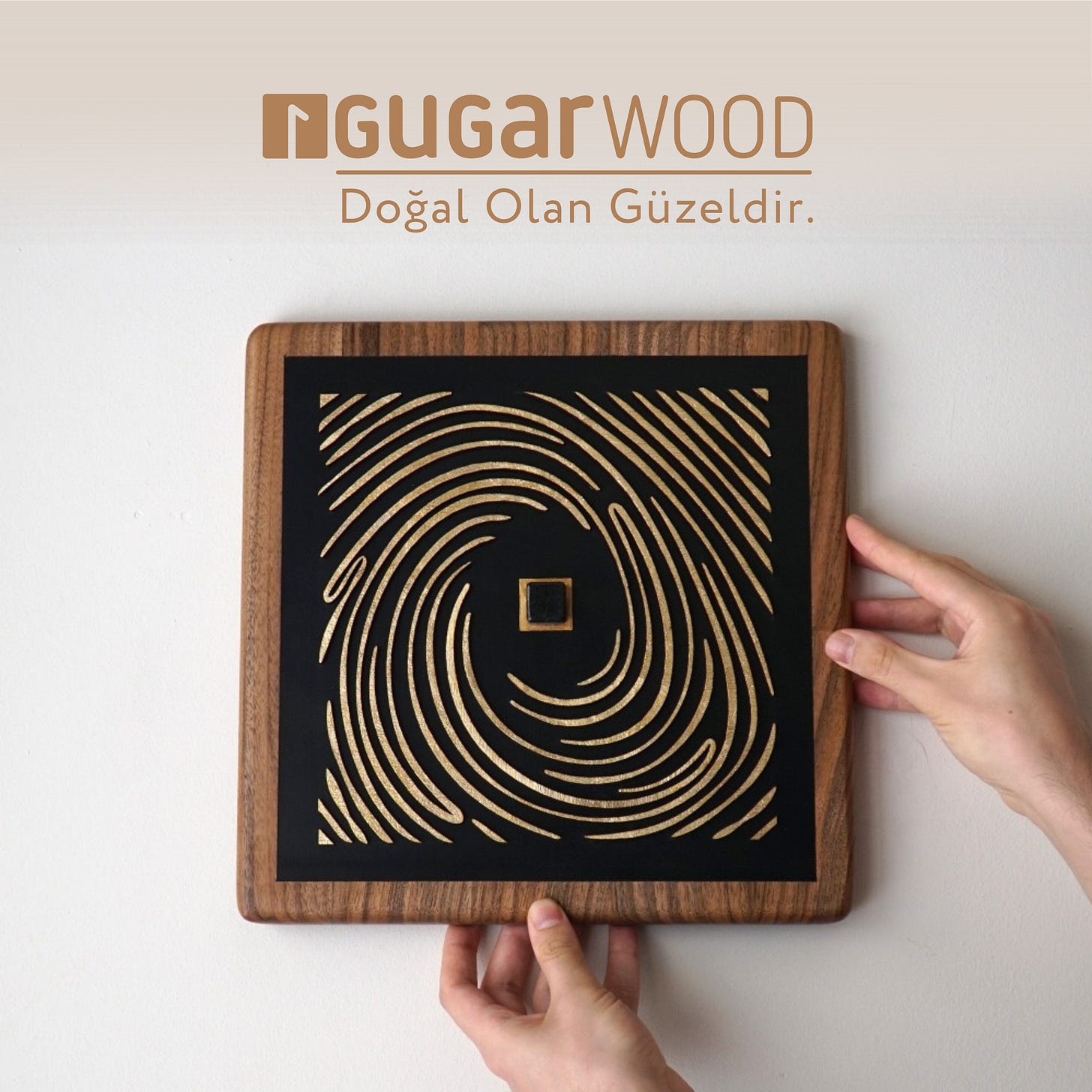 “İzler ve İsimler” koleksiyonunun bir parçası olarak “İzler” tablosu, tavafın insanda bıraktığı eşsiz tecrübenin izlerini anlatıyor. Malzeme: Masif Ceviz, Altın Varak, Doğal Granit Taş. Yükseklik: 23 cm, Genişlik: 23 cm.